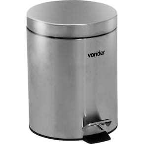 Capacidade: 5 litros | Formato: Redondo | Tipo de tampa: Inox, abertura por pedal | Dimensões: Diâmetro 260 mm / Altura 280 mm | Cor da lixeira: Cinza (Inox) | Material (tipo/composição): Aço Inox 410 | Massa aproximada (peso) (kg): 0,92 kg