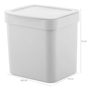 Dimensões da Lixeira: 16,5cm C x 14,5cm L x 17cm A Altura da lixeira com tampa aberta: 30,5cm Dimensões do Suporte: 7,3cm C x 2cm L x 7,3cm A Capacidade da Lixeira: 2,5 Litros Com Suporte de Fixação para Parede Acompanha: 2 buchas e 2 parafusos.