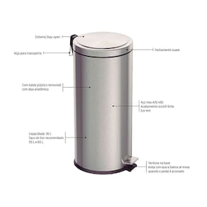Lixeira Tramontina Brasil Plus com Pedal 30L Redonda Inox - AÇO INOX ACETINADO