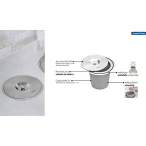 Ficha Técnica Marca: Tramontina Modelo: Clean Round Instalação: Embutida Material: Aço Inox AISI 304 Espessura: 0,8 mm Acabamento: Scotch Brite Tampa: Sim Balde plástico removível: Sim Capacidade: 8 L Saco de lixo recomendado: 15 - 20 L