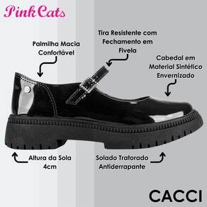 O Sapato Pink Cats Infantil Tratorado é um modelo de sapato estilo Mary Jane, com sola tratorada, feito em material sintético de alta qualidade. Seu design minimalista é ressaltado pelo detalhe em verniz em toda a sua superfície, o que o torna uma opção alegre e descontraída para o dia a dia das crianças. Além disso, a tira com fechamento ajustável e detalhe metalizado sobre o pé confere um charme especial ao sapato.