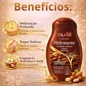 Descubra o prazer de uma pele profundamente cuidada com a Loção Deo Hidratante Corporal Muriel Amêndoa Com Avelã 200ml. Este produto é a escolha perfeita para quem busca unir hidratação intensa, nutrição profunda e uma fragrância suave e envolvente em um único item de cuidado diário. Desenvolvida pela MURIEL, esta loção transforma sua rotina em um verdadeiro momento de bem-estar.