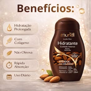 A Loção Deo Hidratante Muriel Amêndoa Com Colágeno é perfeita para o cuidado diário do corpo, ideal para ser utilizada após o banho, proporcionando uma sensação de bem-estar e frescor que dura o dia todo. É um aliado essencial para manter a pele hidratada e protegida em qualquer estação, especialmente para quem busca combater o ressecamento e manter a elasticidade da pele. Ideal para usar em casa, no trabalho ou após atividades físicas, mantendo sua pele sempre hidratada e perfumada.