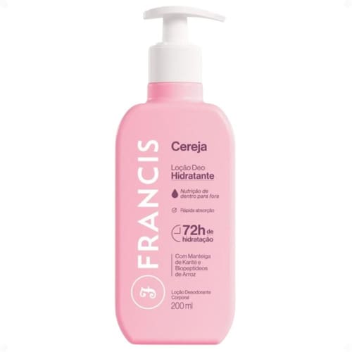 Loção Deo Hidratante Francis Cereja 200ml Desfrute de uma experiência sensorial única com a Loção Deo Hidratante Francis Cereja 200ml. Desenvolvida para quem busca uma pele profundamente hidratada e delicadamente perfumada, esta loção é a escolha perfeita para o cuidado diário. Sinta a maciez e o toque aveludado que a Francis proporciona, envolvendo seu corpo com a irresistível fragrância de cereja.