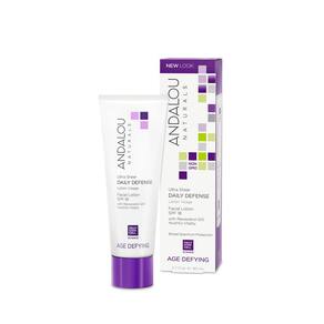 Loção facial Andalou Naturals Ultra Sheer Daily Defense, SPF 18, 2,7 onças, com resveratrol CoQ10 e antioxidantes, hidratante facial leve e hidratante