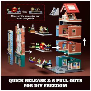 A estrutura frontal pode ser removida para converter o modelo em uma casa de bonecas aberta, com acesso integral ao interior. Os seis níveis internos são modulares e destacáveis, permitindo reorganizar andares e expositores com base em prateleiras com pinos para fixação de peças.?