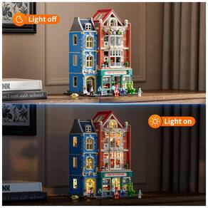 Conjunto de blocos de montar com 3086 peças que representa uma loja de brinquedos em estilo de rua europeia, inspirada em arquitetura da era eduardiana, com fachada em tons de vermelho persimmon, vitrines detalhadas e elementos lúdicos na calçada. A edificação em formato de townhouse é organizada em múltiplos pavimentos, com vitrines de exposição, letreiro superior e detalhes externos como amarelinha e brinquedos decorativos na frente.??