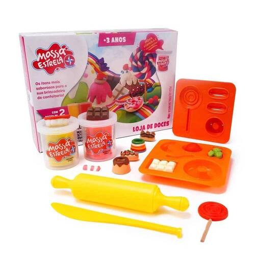 Loja De Doces Massa Estrela 02 Potes Ref.1001301400242 Loja de Doces com Massa Estrela conta com dois potes de massa de 50g e duas formas com moldes de pirulito, balas, chocolate, gelatinas, donuts, churros e bolinho. Características:ean: 7896027561340Marca: EstrelaModelo: Ref.1001301400242idade recomendada: +3 AnosConteúdo da embalagem:01 Forma com 5 figuras01 Bala dentadura01 Bala com bolinhas01 Bala ursinho01 Bala minhoca01 Barra de chocolate01 Donut01 Forma com 4 figuras01 Pirulito02 Churros01 Pudim02 Potes de massa com 50g01 Faquinha01 Rolinho Dimensões da Embalagem:Altura: 16cmLargura: 23cmProfundidade: 7cmPeso: 0,300KgGarantia: 3 MesesHomologação Inmetro: CE-BRI/IQB 006332 52225/18-002