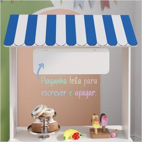 Acompanha 2 opções de adesivo para o telhado (vermelho e azul), permitindo que o cliente escolha a cor que mais combina com o ambiente. Conta também com plaquinha removível, feita para escrever e apagar, perfeita para anunciar promoções ou o nome do mercadinho.