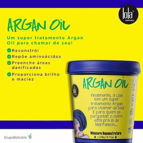 Máscara Capilar Lola Cosmetics Argan Oil ajuda a preencher as áreas danificadas da cutícula do cabelo enquanto o óleo de Argan, presente em sua fórmula, finaliza o processo de reconstrução. É liberada para as técnicas de Low e No Poo e ainda restaura e protege a fibra capilar, reduz o frizz e dá brilho.