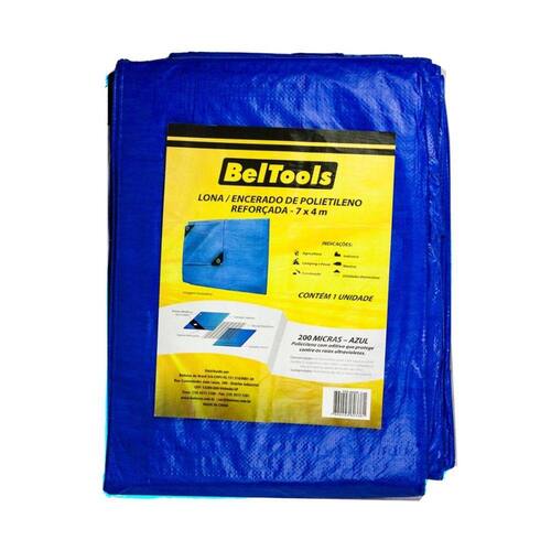 Lona Carreteiro Plástica Reforçada Azul 7x4m Beltools Cor: Azul.Medidas: 7 x 4 metros.Possui cantos reforçados e fio sintético ao redor da bainha para maior resistência. Fabricada em polietileno de alta e baixa densidade, com aditivo que protege contra os raios ultravioleta. Impermeável. Possui amostra do produto fora da embalagem.Indicada para indústria, agricultura, construção civil, náutica, camping, pesca, recreação, utilidades domésticas, entre outros. Não utilizar em contato com produtos químicos e resinas e para cobertura de peças perfurantes/cortantes. O esforço excessivo e a ação de ventos fortes podem provocar o rompimento dos ilhoses, bem como da lona. Conservação: armazenar longe de fontes de calor. Caso necessário, lavar com água e sabão neutro.Distância entre ilhoses: A cada 1 metro.Código: 60338Marca: Beltools