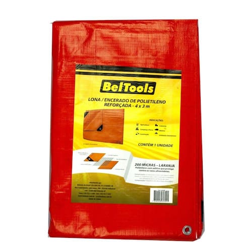 Lona Carreteiro Plástica Reforçada Laranja 4x3m Beltools Cor: Laranja.Medidas 4 x 3 metros. Possui cantos reforçados e fio sintético ao redor da bainha para maior resistência. Fabricada em polietileno de alta e baixa densidade, com aditivo que protege contra os raios ultravioleta. Impermeável. Possui amostra do produto fora da embalagem.Indicação: Indicada para indústria, agricultura, construção civil, náutica, camping, pesca, recreação, utilidades domésticas, entre outros.Não utilizar em contato com produtos químicos e resinas e para cobertura de peças perfurantes/cortantes.O esforço excessivo e a ação de ventos fortes podem provocar o rompimento dos ilhoses, bem como da lona. Conservação: armazenar longe de fontes de calor. Caso necessário, lavar com água e sabão neutro.Distância entre ilhoses: A cada 1 metro.Código: 60309Marca: Beltools