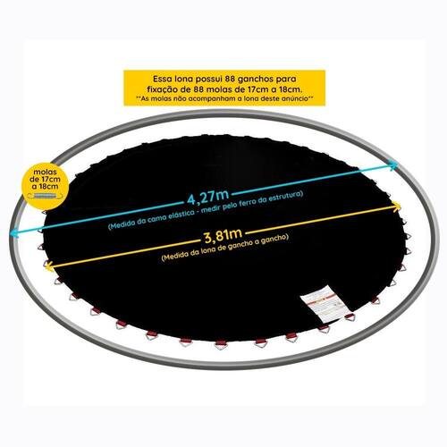 Essa Lona de Salto possui 3,81m de diâmetro e já vem com 88 ganchos fixados para molas de 17cm a 18cm. Portanto: