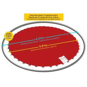 Essa Lona de Salto possui 3,81m de diâmetro e já vem com 72 ganchos fixados para molas de 17cm a 18cm. Portanto: