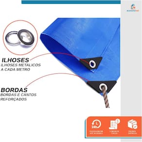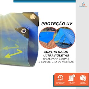 CARACTERÍSTICAS TÉCNICAS: Material: Alta densidade 60% polietileno (HDPE) e 40% baixa densidade (LDPE) Medidas: 8m x 7m Gramatura total: 105g/m2 100% Impermeável Resistente Cor: Azul Possui ilhós a cada metro, fio por dentro da bainha Cantos e lados reforçados para maior durabilidade Proteção UV. Marca: Starfer Ref.: 8700265