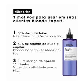 L'Oréal Professionnel Blondifier Gloss Concentrate TreatmentTratamento concentrado para cabelos loiros ou descoloridos. O L'Oréal Professionnel Blondifier Gloss Concentrate Treatment ressurge a fibra capilar e reduz a quebra do cabelo em 80%.O Tratamento concentrado L'Oréal Professionnel Blondifier Gloss Concentrate Treatment foi desenvolvido especificamente para cabelos sensibilizados após o processo de coloração, descoloração ou balayage. Sua fórmula tem Complexo Gluco Polifenol, que fortalece, repõe lipídios e tem efeito antioxidante nos cabelos.