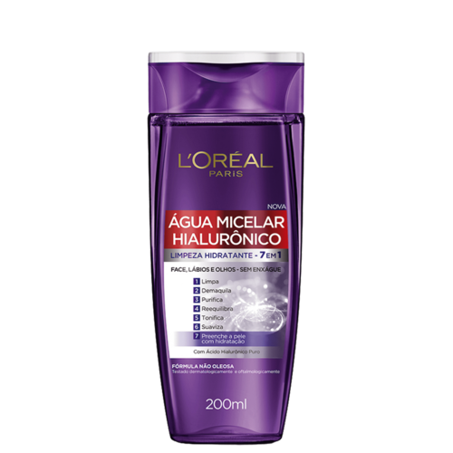 A Água Micelar L'Oréal Hialurônico traz fórmula não-oleosa, enriquecida com Ácido Hialurônico puro: substância produzida naturalmente pelo organismo e presente na pele, com alto poder preenchedor e hidratante, capaz de manter até 1000x o seu peso em água.