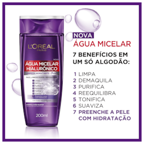 A fórmula de Água Micelar Hialurônico, de L'Oréal Paris, além de limpar profundamente com o auxílio de pequenas micelas, hidrata rugas e previne o aparecimento de linhas de expressão precocemente na pele. A água micelar com ácido hialurônico traz 7 benefícios para seu skincare com apenas 1 produto: limpa, demaquila, purifica, reequilibra, tonifica, suaviza e preenche a pele com hidratação.