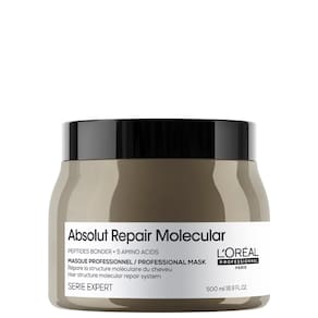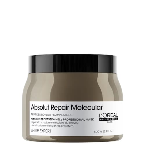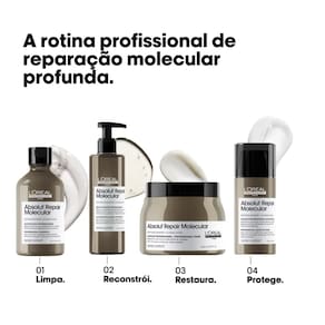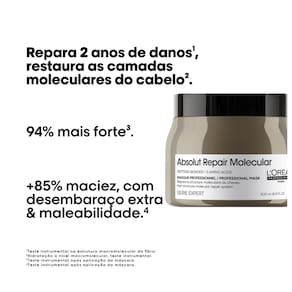 Máscara capilar para cabelos danificados. L'Oréal Absolut Repair Molecular repara e reconstrói profundamente a estrutura molecular do cabelo.Uma vez dentro da fibra, os peptídeos reconstroem a estrutura molecular do cabelo, resultando em fios mais fortes, com mais elasticidade, movimento e maciez. Sua textura sedosa e cremosa, penetra instantaneamente na fibra capilar, proporcionando alto nível de cuidado e força, sem pesar.