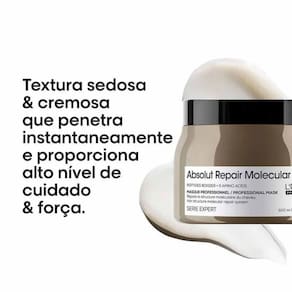 L'oréal Professionnel Absolut Repair Molecular Máscara 500ml Absolut Repair Molecular: Reviva seus cabelos em nível molecular Cabelos danificados e sem vida A Máscara Concentrada Absolut Repair Molecular é a solução que você procura Com sua fórmula inovadora, ela repara profundamente os danos, restaurando a fibra capilar e deixando seus cabelos mais fortes, brilhantes e saudáveis. Por que escolher a Máscara Absolut Repair Molecular 500ml