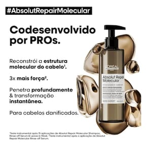 O Sérum Capilar L'Oréal Professionnel Absolut Repair Molecular foi inspirado nos séruns ultra potentes para a pele e penetra profundamente na fibra capilar para reconstruir sua estrutura molecular. Apresenta tecnologia exclusiva que permite a decomposição dos peptídeos em seus componentes fundamentais, que são injetados diretamente na fibra capilar. Essa ação revolucionária resulta na reconstrução completa da estrutura molecular do cabelo, devolvendo a força e vitalidade.