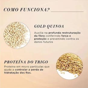 Gold Quinoa e Proteínas: reduz os danos na superfície do cabelo para fios mais brilhantes e com toque leve.