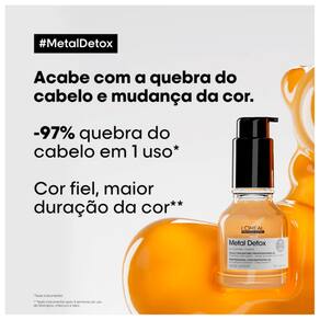 O Óleo Capilar L'Oréal Professionnel Metal Detox auxilia na neutralização das partículas de metal que se acumulam nos fios após as lavagens. Garante fios mais nutridos, densos e com leveza. Proporciona proteção térmica até 230ºC.