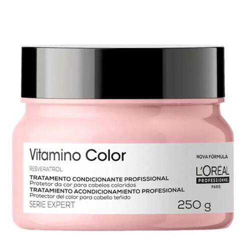 L'Oréal Professionnel Serie Expert Vitamino Color- Máscara para cabelos coloridos. L'Oréal Professionnel Serie Expert Vitamino Color proporciona hidratação, proteção da cor e devolve a maciez e brilho intenso aos fios.- A Máscara L'Oréal Professionnel Serie Expert Vitamino Color promove proteção até das cores mais sensíveis, hidratação e luminosidade para os fios. Seu principal ingrediente, o Resveratrol, é um poderoso antioxidante presente na casca e nas sementes das uvas, que tem a função de preservar a cor dos cabelos por mais tempo. O resultado é um cabelo com 8 semanas de proteção da cor e 7x mais brilho.Conselho de Aplicação- Após lavar o cabelo com shampoo, se achar necessário, aplique o condicionador. E então, aplique a máscara pelo comprimento e pontas. Deixe agir no cabelo por 3-5 minutos. Em seguida, enxágue completamente.Nossos Experts Ensinam- Para potencializar a ação, massageie mecha a mecha, deslizando as mãos no sentido do crescimento do cabelo, com o movimento de enluvá-lo. Espalhe bem. Deixe agir pelo tempo indicado.