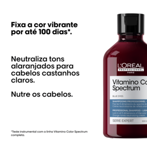 O Shampoo Matizador L'Oréal Professionnel Vitamino Color Spectrum Blue Dyes foi especialmente formulado para cabelos coloridos, principalmente em tom de castanho claro com subtons alaranjados indesejados. Formulado com pigmentos azuis e agentes de tratamento, traz fórmula cremosa azul que neutraliza instantaneamente o alaranjado, resultando em uma cor radiante.