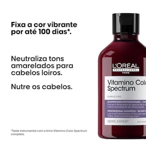 Vitamino Color Spectrum Shampoo Neutralizador De Tons Amarelados Profissional De L'Oréal Professionnel, Formulado Com Pigmentos Roxos E Agentes De Tratamento. A Tecnologia Ajuda A Fixar Os Pigmentos Na Fibra Capilar Para Fixar A Cor Vibrante Do Dia 1 Por Até 100 Dias. Resultados Em 5 Dimensões Da Cor:1. Brilho: Brilho Espelhado Ultraintenso . 2. Saturação: Cores Ricas E Vibrantes. 3. Contraste: Percepção Ideal Entre Múltiplos Tons. 4. Tom: Reflexos Indesejados Neutralizados. 5. Luminosidade: Níveis De Luminosidade E Profundidade São Bem Preservados. A Fórmula Cremosa Roxa Neutraliza Instantaneamente Subtons Amarelados Indesejados Para Cabelos Loiros. O Cabelo Fica Limpo E Nutrido. Teste Instrumental Com A Linha Completa Vitamino Color Spectrum Teste Instrumental Com A Linha Completa Vitamino Color Spectrum Após 4 Semanas. itens Inclusos:1- L'Oréal Profissional Vitamino Spectrum Shampoo 300ml.