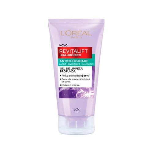 Gel de limpeza antioleosidade. L'Oréal Paris Revitalift Hialurônico limpa profundamente a pele, removendo o excesso de oleosidade.