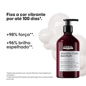 Vitamino Color Spectrum Condicionador Profundo De L'Oréal Professionnel, Formulado Com Ácido Ferúlico + Ácido Cítrico 2,5%. A Tecnologia Ajuda A Fixar Os Pigmentos Na Fibra Capilar Para Fixar A Cor Vibrante Do Dia 1 Por Até 100 Dias. Resultados Em 5 Dimensões Da Cor:1. Brilho: Brilho Espelhado Ultraintenso . 2. Saturação: Cores Ricas E Vibrantes. 3. Contraste: Percepção Ideal Entre Múltiplos Tons. 4. Tom: Reflexos Indesejados Neutralizados. 5. Luminosidade: Níveis De Luminosidade E Profundidade São Bem Preservados. A Fórmula Ultra Hidratante Cria Uma Espuma Densa Que Limpa A Fibra Capilar Completamente Para Um Cabelo Instantaneamente Nutrido E Mais Forte. Teste Instrumental Com A Linha Completa Vitamino Color Spectrum Teste Instrumental Com A Linha Completa Vitamino Color Spectrum Após 4 Semanas. itens Inclusos:1- L'Oréal Vitamino Spectrum Condicionador 500ml. Marca: Não Informado