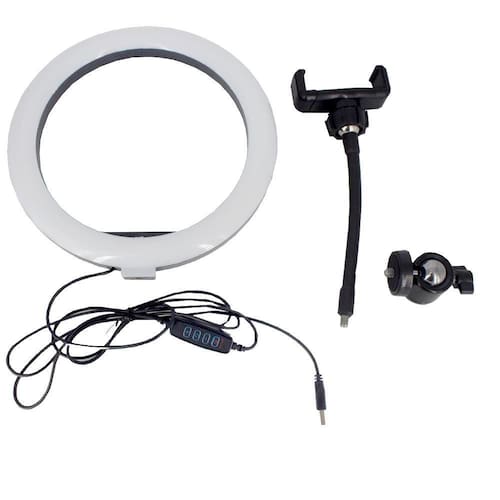 Lote 10 Ring Light Led Selfie Iluminadora Make Foto Luz 26cm Ring LED Light Selfie Iluminadora Maquiagem Luz Quer deixar suas fotos com uma iluminação incrivel e única O Iluminador de LED circular Ring Light RL permite obter uma luz suave e sem sombras devido ao seu formato circular. A Luz obtida por esse produto produz resultados espetaculares em retratos e filmagens em que deseja-se destacar a pele, maquiagem, corte de cabelo e etc. É possível ajustar a intensidade da luz girando o botão. Se preferir luz mais alaranjada, basta encaixar o filtro que acompanha o produto para simular uma temperatura de cor de 3200K.