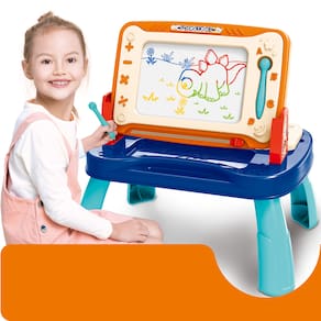 Lousa Mágica: Possui bordas com formas e letras, suporte para caneta, ao escrever a tela fica colorida. Nela a criança pode desenhar diversas formas, letras e até criar cenários. Possuí botão deslizante para apagar e recomeçar o desenho quantas vezes quiser. Perfeito para soltar a imaginação.