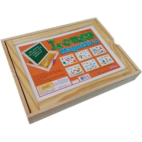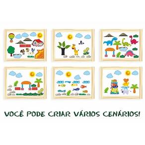 De um lado, temos um quadro magnético com várias peças para encaixar, inclusive algumas que formam quebra-cabeças. As crianças vão adorar montar e criar diferentes cenários utilizando a imaginação. Já do outro lado, temos um quadro para usar com giz, permitindo que as crianças explorem também a escrita e o desenho.