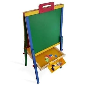 A Lousa Portátil é dupla face e magnética. De um lado, temos um quadro (verde) para giz escolar e outro (branco) para escrever com marcador e e fixar imantados. Proporciona brincadeiras com as peças imantadas com muita criatividade e imaginação. Além de muito divertida, trabalha o conceito da ilustração com desenvolvimento cognitivo, afetivo e social. Tudo aliado ao divertimento e ao prazer de brincar para aprender e ilustrar.