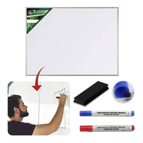 Características Técnicas: Quadro branco para uso de marcador de quadro branco; Tela em chapa de fibra de madeira; Pintura UV de alta durabilidade; Porta marcadores em plástico; Moldura em alumínio; Acompanha acessórios para fixação na parede; Acompanha 2 canetas e Apagador