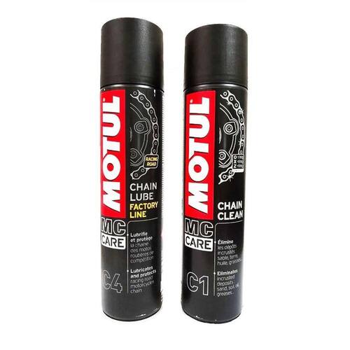 Lubrificante Motul C4 + C1 Chain Clean Correntes Motos 400MlMarca/modelo/aplicação: Conforme ficha técnica do anuncio Recomendamos a instalação em oficina mecânica especializada Itens inclusos: 01 Frasco C4 400 Ml - Frasco C1 400 MlAplicação: Manutenção E Proteção Correntes De Motos - Chain Lube Factory Line é Um Lubrificante Adequado Para Todos Os Tipos De Correntes De Transmissão: Convencionais E Com Juntas Tóricas O-ring, X-ring, Z-ring. Lubrifica Perfeitamente As Correntes De Motos De Competição Na Especialidade De Velocidade E Resistência. Além Disso Sua Utilização é Recomendável Em Correntes De Motos De Estrada.Modelo: Motul MC CARE (tm) C4 C1 Chain LubeMarca: Motul Categoria de produto C4: Manutenção de corrente. Motul MC CARE (tm) C4 Chain Lube FL é um lubrificante de cor branca desenvolvido especialmente para lubrificar as correntes das motos de competição: velocidade e resistência. Formula à base de aditivos sólidos AW / EP (antidesgaste e extrema-pressão)Categoria de produto C1: Limpa perfeitamente todos os tipos de correntes de motos (de estrada e todo-terreno), quads e karts. Elimina todos os depósitos incorporados: areia, terra, óleo, gordura... Fórmula sem cloro.Imagem Meramente Ilustrativa