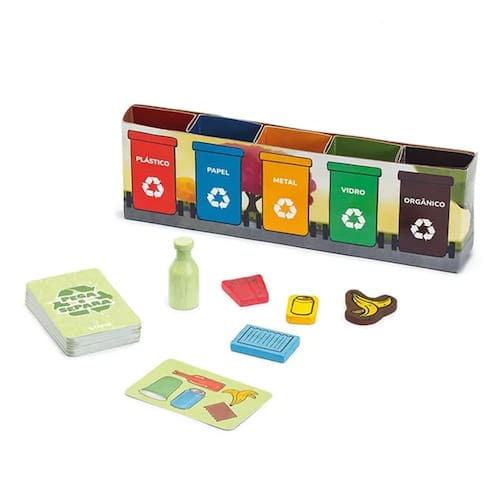 O parque da cidade está cheio de lixo no chão! Vamos ajudar com a limpeza pegando e separando toda essa sujeira? Pega e Separa é um jogo que estimula coordenação, agilidade, concentração, atenção e o aprendizado da classificação dos diferentes tipos de lixo para o correto descarte. Seja o jogador mais ágil a pegar e separar o lixo! Como Jogar? A carta indica qual objeto do lixo deve ser pego: aquele que estiver desenhado com a mesma cor da peça correspondente. O jogador que for o mais rápido a pegar esse objeto do lixo e colocá-lo na sua respectiva lixeira retém aquela carta. Quem acumular mais cartas ao final do jogo vence