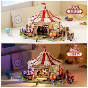 O circo Travelling Circus (L9079) traz cerca de 1926–1962 peças, tenda de grande vão livre com paredes inclinadas e topo elevado, e sete pontos de iluminação distribuídos entre palco, bastidores, tenda da vidente e ambiente externo de parque de diversões. A estrutura adota sistema de liberação rápida em laterais, fundo e seções de piso, permitindo abertura ampla para encenação com minifiguras e visualização do interior.?