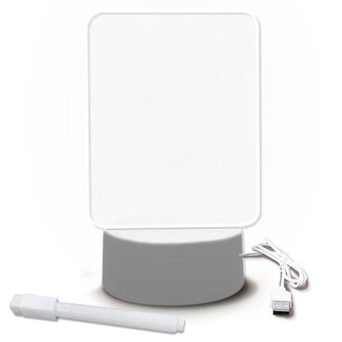 Luminária 3D de Escrever Abajur Tipo Lousa Acrílico + Caneta A Luminária tem um lindo efeito 3D de ilusão óptica, esse efeito se torna possível devido a luz acoplada em sua base que é projetada sobre o desenho de acrílico transformando-a em um objeto 3D iluminado. Você ficará surpreso com o lindo efeito 3D visual. A base da luminária é feita de plástico ABS super resistente onde fica acoplado o feixe de luz que é projetado para iluminar a peça de acrílico. As luminárias 3D são usadas para decoração de casa ou escritório, é também uma ótima opção para presentes. É usada também para compor cenários de festas, casamentos, aniversários temáticos e muito mais Principais características: Cores da luz: Luz Branca Quente Cor da Base: Branca Cabo USB alimentado para baixo consumo de energia. Dimensões: Tamanho aproximado da luminária: 17cm base + acrílico Tamanha da base circunferência: 10cmTamanho da altura da base: 4 cm Carregamento: Cabo USB acoplado. Itens Inclusos: 1. Peça de acrílico 1. Base com cabo USB acoplado 1. Caneta de Giz Líquido OBS: Os itens são enviados desmontados, ao receber, encaixe a peça de acrílico na base e conecte o cabo para ligar a luminária. Não acompanha a fonte de energia. O Cabo UBS que acompanha o produto, pode ser plugado em qualquer fonte de energia ou qualquer porta USB. Como limpar Recomenda-se usar uma flanela de óculos para retirar a escrita do acrílico ou água com sabão.