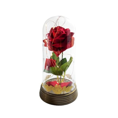 especificação técnica: - marca: amor lindo boutique - altura: 19 cm - diâmetro: 10 cm - material da redoma: acrílico - material da rosa: veludo, plástico e metais - material do fio de led: metais e plástico - material da rosa: seda ou veludo e plástico - cúpula de acrílico translúcido com tribais dourados - base de plástico - micro luzes de leds / luzes de fadas que, funcionam com apenas 2 baterias cr 2032 já inclusas ;