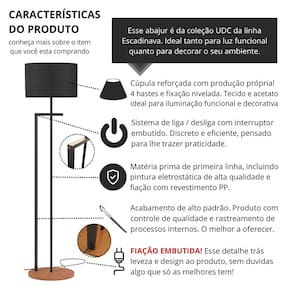 Tipo: Luminária Modelo: Salone Cor tecido: Preto Cor base: Preto Voltagem: Bivolt Acabamento em Pintura Eletrostática Cúpula em Acetato com Acabamento em Tecido Brugges Estrutura em Aço Carbono com Reforço 4 hastes