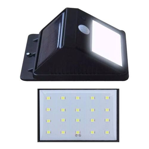 Luminária solar com detetor de movimento e acendimento automático acionada pela intensidade de luz ambiente. Com autonomia de até 6 horas, grande intensidade de luz, é destinada a áreas externas já que é a prova d água. Economia, praticidade e segurança em um mesmo produto. Esta luminária ativa quando anoitecer e permanece desligada até o acionamento pelo sensor de movimento, sendo ideal para balizamento de caminhos, jardim, corredores, etc. Características: Potência: 4w Policristalino painel solar de silicone: Taxa de conversão de 18% Cor da Luz: Branco frio Painel Solar: 6 volts 1 w Bateria de lítio 3.7 v, 1200 mAh Potência de saída: 3.2v 2w 20 LEDs: smd de alta potência Material: abs Fluxo luminoso: 270 lm Índice de reprodução de cor: 80 Ângulo de Abertura 50% : 120º Distancia máxima do sensor de presença: 5 a 10 metros Fator potência: = 0.8 Autonomia de iluminação: 6 horas Temperatura de operação: -20°C a 40°C Dimensões do produto: 124mm C x48 A x95 L Sensor de Presença: sim Foto Célula: sim acende sozinho a noite Interruptor on/off Tipo de instalação: fixado na parede ou chão Interruptor: botão Conteúdo da embalagem: 1.Luminária solar 1.Parafuso e bucha 1º Instale a luminária na parede em local externo onde o sol toque a superfície do painel solar 2º Durante o dia a luminária irá desligar automaticamente, e passar a armazenar a energia solar em sua bateria. 3º A noite a luminária irá acender automaticamente ao notar movimento no campo de sensibilidade do seu sensor de presença. O sensor de presença reconhece movimentos dentro de uma área de 5 a 10 metros. 4º Após 10 segundos de inatividade a luminária irá entrar em modo standby sem atividade .