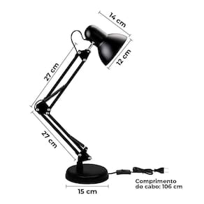 Desing, modernidade e conforto para a sua leituraA luminaria articulavel com base para mesa é ideal para você que estuda ou trabalha e preza por um ambiente mais iluminando. A luminária articulada de mesa vai lhe auxiliar, deixando o ambiente mais claro, favorecendo para a sua concentração e foco, e deixando também o ambiente com um visual mais moderno.A luminaria abajur de mesa é feita de um material de ótima qualidade e possui em sua estrutura articulações para que assim você possa dirigir o foco de luz para onde desejar.Ela é compatível com lâmpadas e27, possui um sistema bivolt e compacta.Algumas perguntas O que é luminaria articulada de mesaA luminaria articulada de mesa com base é um produto essencial para você ter em sua casa ou escritório. Ela é utilizada para auxiliar você durante os estudos, trabalho e suas leituras. Por que usar luminaria articulada de mesaA luminaria de mesa articulada ajuda a manter o foco e a concentração durante o trabalho ou estudo, pois é possível direcionar a luz para o local desejado. Ela possui bocal para lâmpadas e27, sendo compatível com lâmpadas de até 40 watts.Quais os benefícios de usar luminaria articulada de mesaA luminaria articulavel de mesa possui articulações que ajudam a movimentá-la e direcionar o a luz para onde preferir. Ela possui um corpo com altura máxima de até 68 cm auxiliando assim a luminosidade em um maior alcance. Características luminaria articulada de mesa- a luminaria articulada de mesa possui uma base estável que proporciona firmeza para a luminária- possui um bocal compatível com lâmpadas e27- possui um interruptor de ligar/desligar, localizado na parte do fio que liga na tomada- tem um estilo clássico e material de boa qualidade- seu corpo pode ser esticado até 68 cm, aumentando assim a área de iluminação- sua base tem 15 cm de diâmetro, e sua cúpula tem de 12 cm de diâmetro. Especificações luminaria articulada de mesaMaterial: metalVoltagem: bivoltLâmpadas: e27 de até 40 watts.Itens inclusos1 luminaria articulada de mesa bivolt com baseObs: não acompanha a lâmpada