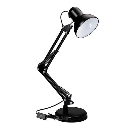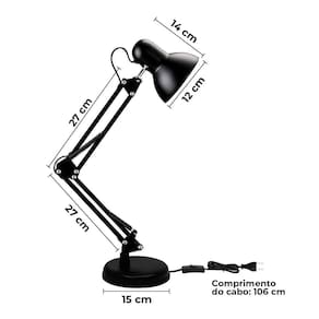 Desing, modernidade e conforto para a sua leitura A luminaria articulavel com base para mesa é ideal para você que estuda ou trabalha e preza por um ambiente mais iluminando. A luminária articulada de mesa vai lhe auxiliar, deixando o ambiente mais claro, favorecendo para a sua concentração e foco, e deixando também o ambiente com um visual mais moderno. A luminaria abajur de mesa é feita de um material de ótima qualidade e possui em sua estrutura articulações para que assim você possa dirigir o foco de luz para onde desejar. Ela é compatível com lâmpadas e27, possui um sistema bivolt e compacta. Algumas perguntas O que é luminaria articulada de mesa A luminaria articulada de mesa com base é um produto essencial para você ter em sua casa ou escritório. Ela é utilizada para auxiliar você durante os estudos, trabalho e suas leituras. Por que usar luminaria articulada de mesa A luminaria de mesa articulada ajuda a manter o foco e a concentração durante o trabalho ou estudo, pois é possível direcionar a luz para o local desejado. Ela possui bocal para lâmpadas e27, sendo compatível com lâmpadas de até 40 watts. Quais os benefícios de usar luminaria articulada de mesa A luminaria articulavel de mesa possui articulações que ajudam a movimentá-la e direcionar o a luz para onde preferir. Ela possui um corpo com altura máxima de até 68 cm auxiliando assim a luminosidade em um maior alcance. Características luminaria articulada de mesa - a luminaria articulada de mesa possui uma base estável que proporciona firmeza para a luminária - possui um bocal compatível com lâmpadas e27 - possui um de ligar/desligar, localizado na parte do fio que liga na tomada - tem um estilo clássico e material de boa qualidade - seu corpo pode ser esticado até 68 cm, aumentando assim a área de iluminação - sua base tem 15 cm de diâmetro, e sua cúpula tem de 12 cm de diâmetro. Especificações luminaria articulada de mesa Material: metal Voltagem: bivolt Lâmpadas: e27 de até 40 watts. Itens inclusos 1 luminaria articulada de mesa bivolt com base Obs: não acompanha a lâmpada Ean: 0709016976421