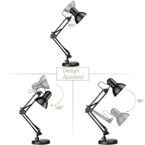 Luminaria articulado com garra e base -para escritório Design, modernidade e conforto para a sua leitura. A luminária articulável com base para mesa é ideal para você que estuda ou trabalha e preza por um ambiente mais iluminando. A luminária articulada de mesa vai lhe auxiliar, deixando o ambiente mais claro, favorecendo para a sua concentração e foco, e deixando também o ambiente com um visual mais moderno. A luminária abajur de mesa é feita de um material de ótima qualidade e possui em sua estrutura articulações para que assim você possa dirigir o foco de luz para onde desejar. Ela é compatível com lâmpadas e27, possui um sistema bivolt e compacta. A luminária articulável de mesa possui articulações que ajudam a movimentá-la e direcionar o a luz para onde preferir. Atenção: voltagem do produto - bivolt Atenção: acompanha garra de fixação Atenção: não acompanha lampada Especificações: Cor: preto Material: metal Possui de liga/desliga localizado na parte do fio que liga na tomada Compatível com lâmpadas: e27 de até 40 watts. 2 modos de fixação Haste articulável e flexível Bocal de cerâmica Informações técnicas: Potência máxima das lâmpadas que podem ser usadas: atenção - o produto não acompanha lampas Led: 18w Incandescente: 60w Eletrônica: 30w Tensão: 60hz Frequência: 0,5 Temp. De operação: -5c á 40 c Índice de proteção: ip40 Dimensões aproximadas da luminária completa incluindo base : Altura: 60 cm Largura: 14 cm Dimensões aproximadas da haste articulada : Altura: 47 cm Largura: 4 cm Dimensões aproximadas do bulbo - cúpula Altura: 10 cm Largura: 12 cm Comprimento: 13 cm Circunferência: 39 cm Dimensões aproximadas da base Altura: 3 cm Largura: 15 cm Circunferência: 49 cm Dimensões aproximadas da garra Diâmetro máximo da boca da garra: 4 cm 3 messes de contra defeito de fabricação 1,300kg mod: pix preto