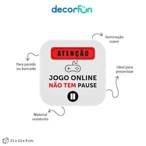 Perfeita para sua decoração, a Luminária Box Jogo Online Não Tem Pause, vai encantar seu quarto, aquele seu cantinho especial ou o ;seu escritório. Essa luminária vai agregar no seu espaço de leitura por ser uma luz difusa, o que não agride a visão, além de deixar o local com uma iluminação mais baixa. Sendo bivolt com a Luminária Box Jogo Online Não Tem Pause, você não precisa se preocupar com nada, basta ligar na tomada e ligar.