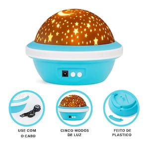 Modos de Iluminação e Cores Disponíveis: Vermelho Verde Azul Vermelho com azul Verde com azul Verde com vermelho 3 cores juntas Controles Fáceis de Usar: Botão A: Liga e desliga a luz Botão B: Alterna entre as opções de cores da projeção (4 principais cores + combinações de cores duplas e trio)
