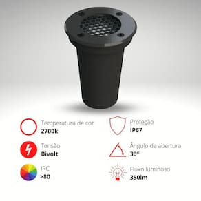 Luminária chão embutido solo 6w 2700k branco quente preto características: - vida útil acima de 8 anos considerando utilização diária de 8 horas. - vedação da lente com silicone térmico. - driver encapsulado com resina térmica. - aro externo jet black. - prensa cabo com vedação e ajuste de pressão. - cabo de borracha maior flexibilidade e resistência ao tempo . - dissipador de calor em alumínio - fabricado em proshield uv, seguro e resistente ao ambiente externo. Descrição técnica: - temperatura de cor: 2700k - potência: 6w - ângulo: 30º - irc: 80 - tensão nominal: bivolt 85-240v - fluxo luminoso: 350lm - intensidade luminosa: 1500cd - frequência nominal: 60hz - fator de potência: 0,7 - dimensões lxa : 105x138mm - peso: 290g - corrente nominal: 52ma 127v / 36ma 220v